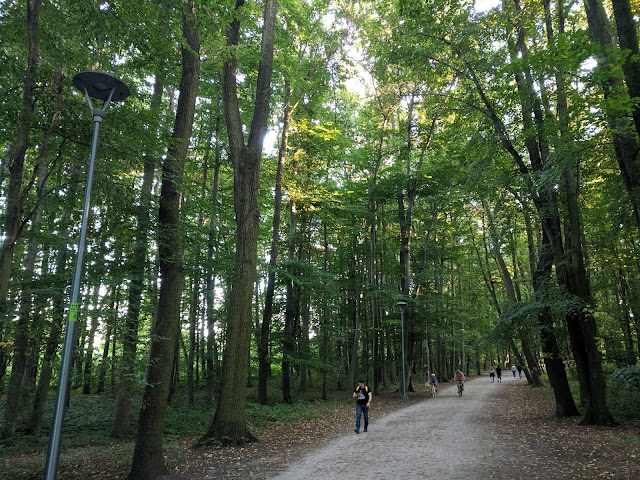 Park Grabiszyński sam ma jednak fragment zbliżony nieco do Południowego i do wszelkich uporządkowanych, mocno miejskich parków z jasno wytyczonymi ścieżkami. To fragment na dawnym Cmentarzu Grabiszyńskim I, najbardziej północny, najmniej mnie ujmujący, najgłośniejszy przez bliskość FATu. Ale już tu jest dość niezwykle - duża liczba bardzo wysokich drzew, przez co nawet tu nigdy nie jest do przesady słonecznie, to nie jest codzienność miejskich parków.