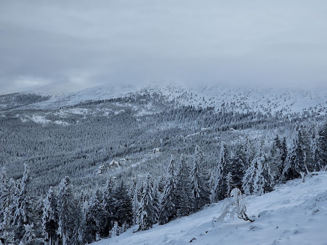 Odsłona zimowa przypadła na zachodnią część powiatu, to znaczy tę położoną na zachód od Jeleniej Góry, co z kolei znaczy, że mówię o gminach Jeżów Sudecki, Piechowice, Stara Kamienica i Szklarska Poręba. To nieco mniej intensywna i chyba nieco mniej oblegana połowa powiatu, która ma wprawdzie to najładniejsze chyba miasto, ale która nie ma Śnieżki i nie jest tak gęsto zapełniona atrakcjami. Zimowa pogoda - która czy to przez to, że śnieg potrafi co nieco przykryć, czy to przez gorszą widoczność - stanowiła tu więc nieco mniejsze zagrożenie dla kompletności relacji. Udało mi się trafić na wydanie bardzo zimowe, dzięki czemu przeżyłem i ująłem na zdjęciach niesamowitość śnieżnego oblicza tego regionu, który w takich dniach zmienia się miejscami w inną planetę. Wysoki śnieg utrudnił jednak osiągnięcie kilku założonych punktów, a faktycznie bardzo słaba przez większość czasu widoczność sprawiła, że relacja pozbawiona jest w swojej pierwszej wersji paru ważnych aspektów. W najbliższym czasie złamię więc zasadę decorum i uzupełnią wpis zdjęciami z innej pory roku. Tymczasem jednak publikuję stuprocentowo zimową relację z tej stuprocentowo zimowej, weekendowej podróży.