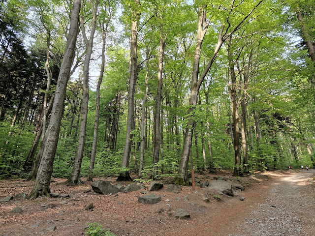 To nie było oczywiście moje pierwsze wejście na Ślężę - chyba każdy, kto wychowywał się we Wrocławiu, musiał na nią wchodzić, jeśli nie w ramach wycieczki z rodzicami, to już co najmniej w ramach wycieczek szkolnych, dla których góra jest wyjątkowo popularnym celem. Z tego względu byłem nieco sceptyczny przed powrotem tu po latach - miałem w głowie wyobrażenie Ślęży jako miejsca zadeptanego, w którym ciężko o spokojny kontakt z przyrodą i historią. A jednak bardzo przyjemnie się zaskoczyłem - mimo że swoje podejście najpopularniejszym szlakiem z przełęczy Tąpadła robiłem w piątek trzeciego maja, czyli potencjalnie jeden z najbardziej zatłoczonych turystycznie dni w roku, to zaczynając wchodzić po 17:00 spacerowało się już miło i spokojnie. Ludzie głównie schodzili, nie wchodził ze mną praktycznie nikt, a na samym szczycie pozostała garstka kilkunastu osób. Pozwoliło to napawać się bez przeszkód pięknem porastającego Ślężę bukowego lasu i odczuć pogańską, prastarą atmosferę tego miejsca, zwłaszcza już blisko szczytu, gdzie zaczynają pojawiać się na potęgę kamienne pozostałości wałów kultowych.