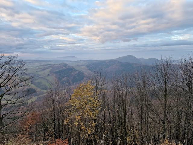 Po nocy niedaleko Mieroszowa wcześnie rano zacząłem już celową eksplorację Parku Krajobrazowego Sudetów Wałbrzyskich. To chyba najbardziej nieprecyzyjnie nazwany na Dolnym Śląsku ze wszystkich. Wbrew swoje nazwie, park nie obejmuje bowiem tylko Gór Wałbrzyskich. Niedopowiedzeniem byłoby nawet powiedzieć, że obejmuje również Góry Kamienne, bo obejmuje przede wszystkim Góry Kamienne - mają one i ilościową, i jakościową przewagę w obrębie granic parku nad Górami Wałbrzyskimi. Dwa moje główne podejścia też były podejściami w Górach Kamiennych. A jaki ten park jest? Jednym z najlepszych: choć obejmuje góry niższe i mniej spektakularne niż większość kluczowych pasm regionu, to za to są one bardzo nieregularnie rozłożone. Można odnieść wrażenie, że przemieszcza się po archipelagu wypukłych wysp, tworzących fantazyjne i zakamarkowe układy. Nie ma tu jednej, gigantycznej góry, ale wydające się nigdy nie kończyć morze mniejszych, co sprzyja klimatowi. I mimo jesieni w pełnej krasie barwnej nie spotkałem na szlaku nikogo.